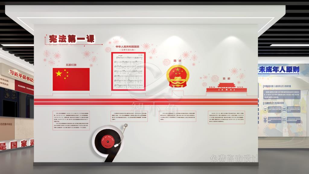 通过墙绘国旗,国徽,天安门、华表、万里长城,人民大会堂、中华人民共和国版图、首都,触发相应的图标后,墙面视频播放区域会通过动画讲解国家标识相关的知识点。